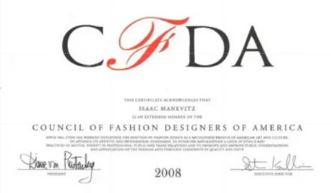 Designer Isaac Manevitz has been a member since the early 1980's and was awarded certificates as an esteemed member in 2008; signed by the then CFDA President, Diane von Furstenberg.